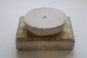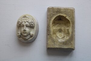Gips-Abformung eines Frauenkopfs mit Diadem als negativ und positiv Form (2 Teile). Die Positivform, also ein Hochrelief wurde als Modell genutzt, um es in Sand abzuformen mit mit Metall (Eisen) auszugießen (vgl. Inv.-Nr. 9.062).