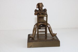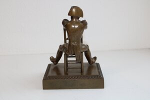 Darstellung Napoleon Bonapartes rücklings auf einem Stuhl sitzend, dabei hat er die Arme verschränkt auf die Rückenlehne des Stuhl aufgelegt. Die kleine Skulptur ist auf eine rechteckige Plinthe montiert. Der Briefbeschwerer ist abgebildet im Katalog der Sayner Hütte aus Krupp´scher Zeit (1865-1926).