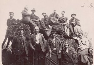 Bei dem abgebildeten Felsen handelt es sich wohl um Geyersley-Teufelswand und Teufelsplatte in der Nähe zur Genovevahöhle. Der typische Sonntagsausflug führte damals von der Genovevahöhle über die Geyersley zur Burg Ramstein. Zu sehen ist eine Gruppe Wanderer, Männer und Frauen, welche Rast an und auf einem Felsen macht. Die Damen tragen Jacken und Röcke, die Herren legere Wanderkleidung. Einige haben Wanderstöcke bzw. Regenschirme dabei. Die jüngeren Frauen sind zu den Männern auf den Felsen geklettert. Etwas im Hintergrund steht ein ca. vierzehn Jahre alter Junge mit Jacke und Kappe. Vom Betrachter aus rechts oben sitzt der Herr Ludwig Savelkouls mit Fernglas in der Hand. Auf der Rückseite des Bildes steht, unter anderem, das Datum "19.06.2026."