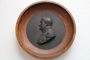 Medaillon aus Eisenguss geschwärzt und mit Holzrahmen versehen. Das Bildnismedaillon zeigt Napoleon I. Bonaparte, Kaiser der Franzosen, um 1807 in der Uniform eines Obersten der Grenadiergarde mit Kreuz und Stern der Ehrenlegion und dem Orden der Eisernen Krone. Es handelt sich um ein Brustbild im Profil nach links. Das Medaillon verfügt auf der Vorderseite über Spuren von Flugrost und zeigt eine Bruchstelle. Das ursprüngliche Modell stammt von Bildnismodelleur Leonhard Posch. Im Katalog von Anne Forschler-Tarrasch ist ein identisches Medaillon unter der Katalognummer 15 mit der Signatur des Modelleurs "Posch F." und der Sayner Hütte "S.H." aufgeführt. Das Medaillon stammt aus dem Nachlass des Formers Paul Thewald der auf der Sayner Hütte ab 1921 gearbeitet hatte. Vgl. Inventar 9.073