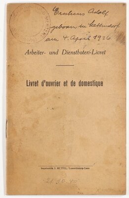 Arbeiter- und Dienstbotenlivret des am 4.April 1926 in Mettendorf geborenen Adolf Erschens. Dieses Arbeitsbuch wurde im Jahr 1940 von der Gemeindeverwaltung Mertert in Luxemburg für den damals 14-jährigen Adolf ausgestellt. Darin ist vermerkt, dass er in einer Mosaikplattenfabrik in Wasserbillig als Fabrikarbeiter angestellt war.