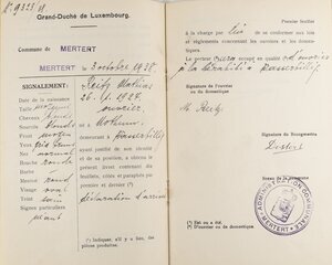 Arbeiter- und Dienstbotenlivret des am 26. Januar 1924 geborenen Matthias Reitz. Dieses Arbeitsbuch wurde am 3. Oktober 1938 von der Gemeindeverwaltung Mertert in Luxemburg für den damals 14-Jährigen ausgestellt. Darin ist vermerkt, dass er vom 4. Oktober 1925 bis zum 9. Mai 1940 in einer Mosaikplattenfabrik in Wasserbillig als Arbeiter angestellt war.