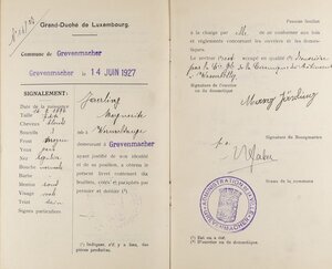Arbeiter- und Dienstbotenlivret des am 14.9.1896 geborenen M. Jürling. Dieses Arbeitsbuch wurde am 14.6.1927 von der Gemeindeverwaltung Grevenmacher in Luxemburg für den damals 30-jährigen Mann ausgestellt. Darin ist vermerkt, dass er vom 15.6.1927 bis zum 9.5.1940 in einer Mosaikplattenfabrik in Wasserbillig als Arbeiter angestellt war. Am 9.5.1940 wurde er über die Fabrik Mitglied der Bezirkskrankenkasse in Wasserbillig.