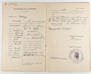 Arbeiter- und Dienstbotenlivret der am 28.8.1921 in Oreuhafen geborenen Margarethe Sergejew. Dieses Arbeitsbuch wurde am 17.1.1938 von der Gemeindeverwaltung Mertert in Luxemburg für die damals 17-Jährige ausgestellt. Darin ist vermerkt, dass sie vom 18.1.1938 bis zum 26.8.1939 in einer Mosaikplattenfabrik in Wasserbillig als Arbeiterin angestellt war. Am 26.8.1939 wurde sie über die Fabrik Mitglied der Bezirkskrankenkasse in Wasserbillig.