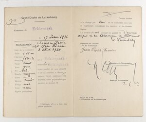 Arbeiter- und Dienstbotenlivret des am 3.8.1920 in Echternach geborenen Jean Pierre Simon. Dieses Arbeitsbuch wurde am 17.6.1936 von der Gemeindeverwaltung Echternach in Luxemburg für den damals 15-Jährigen ausgestellt. Darin ist vermerkt, dass er vom 17.6.1936 bis zum 28.11.1938 in einer Mosaikplattenfabrik in Wasserbillig als Arbeiter angestellt war. Am 28.11.1938 wurde er über die Fabrik Mitglied der Bezirkskrankenkasse in Wasserbillig.