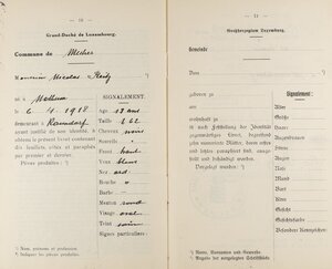 Arbeiter- und Dienstbotenlivret des am 6.4.1918 geborenen Nicolas Reitz. Dieses Arbeitsbuch wurde von der Gemeindeverwaltung Mecher in Luxemburg für den damals 18-Jährigen ausgestellt. Darin ist vermerkt, dass er vom 2.11.1936 bis zum 31.5.1940 in einer Mosaikplattenfabrik in Wasserbillig als Arbeiter angestellt war. Am 31.5.1940 wurde er über die Fabrik Mitglied der Bezirkskrankenkasse in Wasserbillig. Anschließend wurde er am 9.11.1940 bei den Cerabati Plattenwerken in Wasserbillig eingestellt.