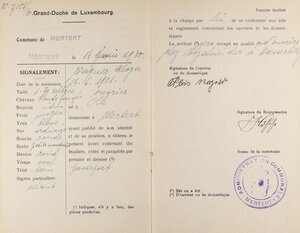 Arbeiter- und Dienstbotenlivret des am 14.6.1901 in Olk geborenen Alois Wagner. Dieses Arbeitsbuch wurde am 16.6.1930 von der Gemeindeverwaltung Mertert in Luxemburg für den damals 29-Jährigen ausgestellt. Darin ist vermerkt, dass er vom 17.6.1930 bis zum 9.5.1940 in einer Mosaikplattenfabrik in Wasserbillig angestellt war. Am 9.5.1940 wurde er über die Fabrik Mitglied der Bezirkskrankenkasse in Wasserbillig.