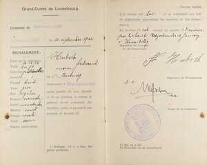 Arbeiter- und Dienstbotenlivret des am 12.12.1864 geborenen Ferdinand Hulsch. Dieses Arbeitsbuch wurde am 12.9.1922 von der Gemeindeverwaltung Grevenmacher in Luxemburg für den damals 57-Jährigen ausgestellt. Darin ist vermerkt, dass er in der Mosaik- und Tonplattenfabrik Utzschneider & Jaunez aus Wasserbillig als Arbeiter angestellt war. Außerdem war er seit dem 13.9.22 Mitglied der Bezirkskrankenkasse in Wasserbillig.