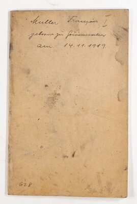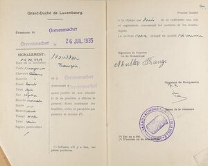 Arbeiter- und Dienstbotenlivret des am 14.11.1919 in Grevenmacher geborenen Franz Müller. Dieses Arbeitsbuch wurde am 26.7.1935 von der Gemeindeverwaltung Grevenmacher in Luxemburg für den damals 15-Jährigen ausgestellt. Darin ist vermerkt, dass er vom 29.7.1935 bis zum 9.5.1940 in einer Mosaikplattenfabrik in Wasserbillig angestellt war. Am 9.5.1940 wurde er über die Fabrik Mitglied der Bezirkskrankenkasse in Wasserbillig.