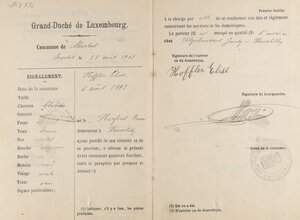 Arbeiter- und Dienstbotenlivret der am 6.8.1893 geborenen Elise Hoffler. Dieses Arbeitsbuch wurde am 28.8.1905 von der Gemeindeverwaltung Mertert in Luxemburg für die damals 12-Jährige ausgestellt. Darin ist vermerkt, dass sie vom 28.8.1905 bis zum 2.4.1913 in der Mosaik- und Tonplattenfabrik Utzschneider & Jaunez aus Wasserbillig als Arbeiterin angestellt war. Anschließend arbeitete sie vom 2.7.1927 bis zum 9.5.1940 erneut in einer Mosaikplattenfabrik in Wasserbillig. Am 9.5.1940 wurde sie über die Fabrik, Mitglied der Bezirkskrankenkasse in Wasserbillig.