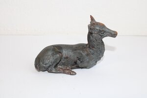 Unbearbeitete (ungeputzte) Abgüsse in Eisen (2 Ex.) und Bronze (1 Ex.) einer kleinen liegenden Hirsch-Skulptur, die Bestandteil eines Briefbeschwerers ist. Zu diesem Zweck wurden auf den Kopf des Hirsch zwei Geweihteile (vgl. 9.077), an den Körper ein weiteres Bein (9.078) und die Skulptur schließlich insgesamt auf eine rechteckige Plinthe (vgl. 9.081) montiert. Der Briefbeschwerer oder Papierdrücker mit liegendem Hirsch ist in dem Katalog bzw. "Modellbuch" der Sayner Hütte aus der Zeit um 1870 abgebildet. Die Güsse stammen aus dem Nachlass des Formers Paul Thewald, der in den 1920er Jahren auf der Sayner Hütte gearbeitet hat und nach dem Zweiten Weltkrieg in der Kunstgießerei der Concordiahütte (Bendorf-Mülhofen).