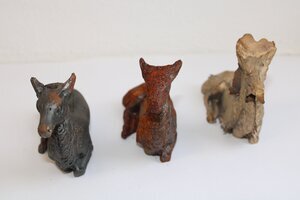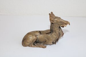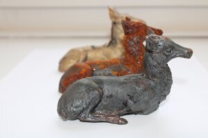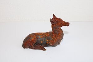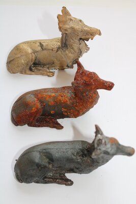 Unbearbeitete (ungeputzte) Abgüsse in Eisen (2 Ex.) und Bronze (1 Ex.) einer kleinen liegenden Hirsch-Skulptur, die Bestandteil eines Briefbeschwerers ist. Zu diesem Zweck wurden auf den Kopf des Hirsch zwei Geweihteile (vgl. 9.077), an den Körper ein weiteres Bein (9.078) und die Skulptur schließlich insgesamt auf eine rechteckige Plinthe (vgl. 9.081) montiert. Der Briefbeschwerer oder Papierdrücker mit liegendem Hirsch ist in dem Katalog bzw. "Modellbuch" der Sayner Hütte aus der Zeit um 1870 abgebildet. Die Güsse stammen aus dem Nachlass des Formers Paul Thewald, der in den 1920er Jahren auf der Sayner Hütte gearbeitet hat und nach dem Zweiten Weltkrieg in der Kunstgießerei der Concordiahütte (Bendorf-Mülhofen).