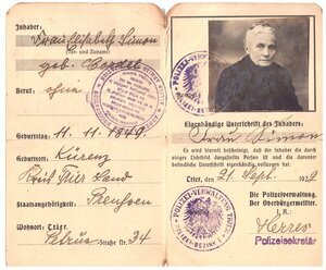 Personalausweis von Elisabeth Simon, geb. Kordel. Ausgestellt am 21.09.1922. Es werden persönliche Daten wie Geburtsdatum, Wohnort und Beruf erfasst. Es gibt ebenfalls ein Lichtbild. Im Ausweis befindet sich ein Stempel in französischer Sprache, mit dem Reise in alle besetzten Gebiete erlaubt sind. Auf der Rückseite befindet sich eine Aufenthaltsgenehmigung für das Saarland vom 28.08.1925 bis zum 28.11.1925.