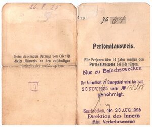 Personalausweis von Elisabeth Simon, geb. Kordel. Ausgestellt am 21.09.1922. Es werden persönliche Daten wie Geburtsdatum, Wohnort und Beruf erfasst. Es gibt ebenfalls ein Lichtbild. Im Ausweis befindet sich ein Stempel in französischer Sprache, mit dem Reise in alle besetzten Gebiete erlaubt sind. Auf der Rückseite befindet sich eine Aufenthaltsgenehmigung für das Saarland vom 28.08.1925 bis zum 28.11.1925.