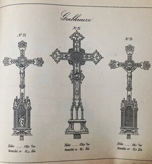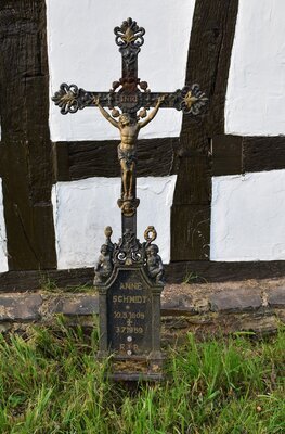 Gusseisernes Grabkreuz für Anne Schmidt. Im oberen Teil der gekreuzigte Christus, darunter eine Plakette mit der Inschrift "ANNE SCHMIT * 10.5.1805 + 3.7.1859. Auf der Plakette sitzen zwei Putti, der linke streckt Kelch und Hostie in die Höhe, der rechte einen Siegeskranz. Unter den Füßen von Christus befindet sich ein Engelskopf. Die Kreuzbalken sind mit vielen Ornamenten geschmückt. Das Grabdenkmal steht nicht an seinem originalen Standplatz, sondern wurde von einem aufgelassenen Grab in das Museum übertragen. Nahezu identisch mit Grabkreuz Grabdenkmal 19 2021 Das Grabkreuz wurde von der Concoriahütte, Gebrüder Lossen in Bendorf hergestellt. Es ist die No 24 im Musterkatalog "Gusswaaren-Abbildungen" von 1880. Wir bedanken uns beim Rheinisches Eisenkunstgussmuseum Bendorf-Sayn für die Unterstützung bei der Digitalisierung dieses Kreuzes.