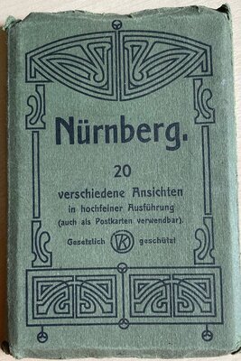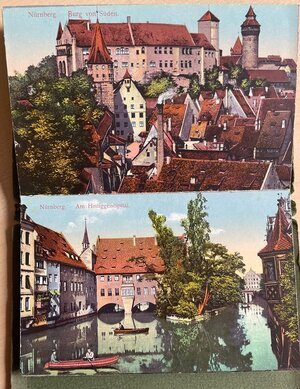 Ein Sammler aus Karton. Er enthält zwanzig verschiedene, farbige Postkarten von Nürnberg die miteinander verbuinden sind. (Klappkarten). Enthalten sind die wichtigsten Sehenswürdigkeiten, die Nürnberg zu bieten hat. Die Burg. die Kaiserstallungen, Heiliggeistpital, das Gänsemännchen, der Tugendbrunnen und vieles mehr. Alle Karten können auch als Postkarten verwendet werden.
