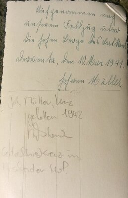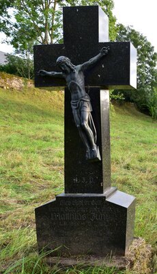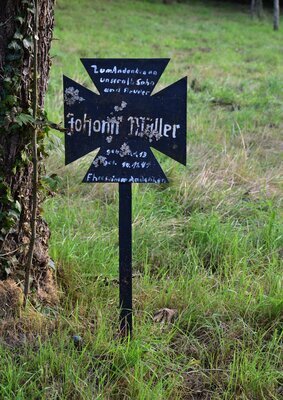 Gedenkkreuz in leicht abgewandelter Form eines "Eisernen Kreuzes" mit folgender Inschrift: "Zum Andenken an unseren Sohn und Brunder Johann Müller geb. 10.1.13 gest. 10.11.41" Ehre seinem Andenken. Das Kreuz steht nicht an seinem originalen Standplatz. Das Kreuz stammt aus Konz. Das tatsächliche Grab des Soldaten liegt in Russland. Das Foto und der Brief stammen aus seinem Briefnachlass (heute in Privatbesitz).