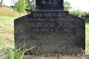 Klobiges schwarzes Grabkreuz aus Kunststein mit einem Corpus aus Metall. Das eigentliche Kreuz steht auf einem schmalrechteckigen Sockel. Auf dem Sockel findet sich die folgende Inschrift: "Hier ruht in Gott mein lb Gatte unser guter Vater Matthias Juny * 4. 11. 1882 + 6. 7. 1932" Höchstwahrscheinlich der Ehemann von Katharina Juny mit Grabdenkmal 1 2021 Darunter eine Gedenkinschrift für seinen im WW2 gefallen Sohn: zum Andenken an unseren lb. Sohn und Bruder Arnold * 1913 gest. 1940 Das Grabdenkmal steht nicht an seinem originalen Standplatz, sondern wurde von einem aufgelassenen Grab in das Museum übertragen.