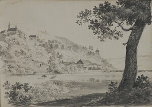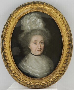 Porträt der Reichsgräfin Marianne von der Leyen (1745-1804), geborene Freiin von Dalberg, in fürstlichem Ornat mit Hermelinbesatz. Marianne von der Leyen war nach dem Tod ihres Mannes Franz Karl (1736-1775) von 1775 bis 1793 für ihren Sohn Philipp (1766-1829) die Regentin der Grafschaft Hohengeroldseck mit Sitz in Blieskastel. Sie regierte – wie schon zuvor ihr Mann – im Stil des aufgeklärten Absolutismus. Sie investierte in soziale und kulturelle Einrichtungen und in die wirtschaftliche Entwicklung ihres Landes, schaffte die Leibeigenschaft ab und führte die Schulpflicht ein. Doch blieb sie absolutistische Fürstin, die sich einer stärkeren Partizipation durch die Bevölkerung verschloss, die wiederum manche obrigkeitlichen Eingriffe als Verletzung althergebrachter Rechte auffasste. So kam es unter Eindruck der Französischen Revolution 1789 im Rahmen des so genannten St. Ingberter Waldstreits sogar zu Aufständen, die von kurpfälzischen und kurmainzer Truppen niedergelegt wurden. 1793 besetzten französische Revolutionstruppen Blieskastel. Marianne konnte – verkleidet als Magd – fliehen und starb 1804 im Exil in Frankfurt am Main. Ihre Flucht hielt sie in einem in Französisch verfassten Bericht fest, der maßgeblich zu ihrer späteren Verklärung beitrug. Sie ließ zahlreiche herrschaftliche Bauten errichten, was die Finanzlage der Grafschaft extrem anspannte, und umgab sich gerne mit Künstlern, zu denen unter anderem Johann Christian von Mannlich gehörte, dem das Porträt zugeschrieben wird. [Johanna Kätzel]