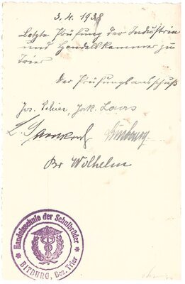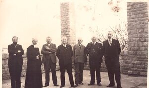 Zu sehen sind sieben Herren auf einer offenen Veranda. Diese bildeten den Prüfungsausschuss der Industrie- und Handelskammer in Trier. Es ist, wie auf der Rückseite der Karte vermerkt, die letzte Prüfung an der Handelsschule der Schulbrüder am 03.04.1938. Die Männer blicken ernst in die Kamera. Der zweite, vom Betrachter aus gesehen, ist der Herr Ludwig Savelkouls. Auf der Bildrückseite haben alle unterschrieben und es ist auch ein Stempel der "Handelsschule der Schulbrüder" zu sehen.