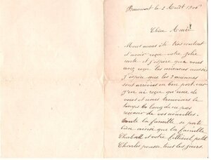 Der dreiseitige Brief auf einem gefalteten Doppelbogenwurde am 2. August 1906 aus der französischen Stadt Baccarat geschrieben. Adressat und Schreiber sind leider unbekannt. Der Verfasser bedankt sich für den zuvor erhaltenen Brief. Es gehe allen gut und es werde an den Adressaten gedacht. Jemand aus dem Bekanntenkreis werde bald heiraten. Man vermisse sich und warte auf baldige Neuigkeiten. Man umarme sich in Gedanken von weitem und hofft auf ein baldiges Wiedersehen. Der Brief enthält viele Floskeln und entspricht dem formellen, höflichen Stil des 19.Jahrhunderts.