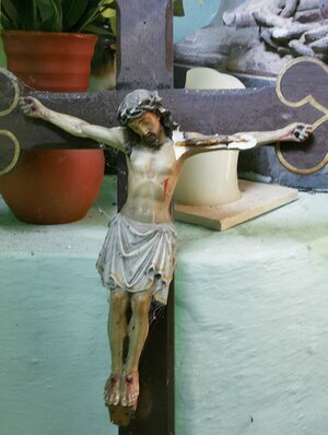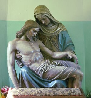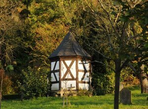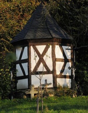Die Fachwerkkapelle stammt aus der Zeit um 1730 aus Bürder, wenige Kilometer nördlich von Neuwied, landschafltich aus dem Tal der Wied im Westerwald , dem sogenannte Bürderer Loch. Die innenstehende Pieta aus dem Garten des Pfarrhauses Heinersheim, Ahr. Sie ist eine freundliche Gabe der Trierer Diözese und mußte einem neu errichteten Kirchlein weichen. Bürder liegt jedoch rechts des Rheins und damit eigentlich außerhalb des Einzugsgebiets des Freilichtmuseums. So stand das Museums, als ihm die Kapelle angeboten wurde, vor der Frage, vor der so ähnlich wohl schon jedes Freilichtmuseum gestanden hat: Richtet sich das Konzept nach vorher festgelegten Kriterien auch auf die Gefahr hin, daß historische Bausubstanz, die "nicht ins Konzept" paßt unwiderruflich verloren geht, oder ist das eigene Konzept so flexibel angelegt, daß unvorhergesehene Ereignisse sich ins Gesamtbild einfügen lassen? Die Kapelle wurde schließlich ins Freilichtmuseum übernommen und fand 1985 ihren neuen Platz als Wegekapelle unterhalb des Rosengartens. Das kleine Gotteshaus ist der "Schmerzhaften Mutter" geweiht. In der Kapelle steht eine Pieta aus dem alten Pfarrgarten in Heimersheim b. Ahrweiler. Im Umkreis sind alte Grabkreuze gruppiert.