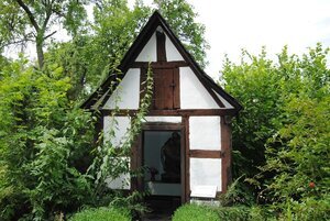 Die Fachwerkkapelle stammt aus der Zeit um 1730 aus Bürder, wenige Kilometer nördlich von Neuwied, landschafltich aus dem Tal der Wied im Westerwald , dem sogenannte Bürderer Loch. Die innenstehende Pieta aus dem Garten des Pfarrhauses Heinersheim, Ahr. Sie ist eine freundliche Gabe der Trierer Diözese und mußte einem neu errichteten Kirchlein weichen. Bürder liegt jedoch rechts des Rheins und damit eigentlich außerhalb des Einzugsgebiets des Freilichtmuseums. So stand das Museums, als ihm die Kapelle angeboten wurde, vor der Frage, vor der so ähnlich wohl schon jedes Freilichtmuseum gestanden hat: Richtet sich das Konzept nach vorher festgelegten Kriterien auch auf die Gefahr hin, daß historische Bausubstanz, die "nicht ins Konzept" paßt unwiderruflich verloren geht, oder ist das eigene Konzept so flexibel angelegt, daß unvorhergesehene Ereignisse sich ins Gesamtbild einfügen lassen? Die Kapelle wurde schließlich ins Freilichtmuseum übernommen und fand 1985 ihren neuen Platz als Wegekapelle unterhalb des Rosengartens. Das kleine Gotteshaus ist der "Schmerzhaften Mutter" geweiht. In der Kapelle steht eine Pieta aus dem alten Pfarrgarten in Heimersheim b. Ahrweiler. Im Umkreis sind alte Grabkreuze gruppiert.