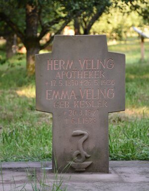 Grabdenkmal der Familie Veling, die seit 1907 die Stern-Apotheke gegen über dem Hauptbahnhof in Konz als erste und lange Zeit einzige Apotheke in Konz betrieb. Das Grabdenkmal, besteht aus 3 Kreuzen. Das mittlere, deutlich größere Kreuz trägt den Gekreuzigten. Die beiden flankierenden, deutlich kleineren Kreuze tragen die folgenden Inschriften: Links Kreuz: ALBERT WALTER PHARMAZIERAT * 5. 10. 1909 4. 4. 1988 HANNA WALTER GEB. VELING *6. 3. 1913 20. 4. 1984 Darunter als Gegenstück zum Apothekersymbol auf dem rechten Kreuz befindet sich hier unter den Inschriften ein Halbrelief mit einer aus einer Schale wachsenden Blume. Rechtes Kreuz: HERM. VELING APOTHEKER * 17.5.1870 26.5.1936 EMMA VELING GEB KESSLER * 20. 3. 1881 6. 1. 1938 Darunter als Halbrelief das Apothekersymbol (Schlange und Schale) Das Grabdenkmal steht nicht an seinem originalen Standplatz, sondern wurde von einem aufgelassenen Grab in das Museum übertragen.
