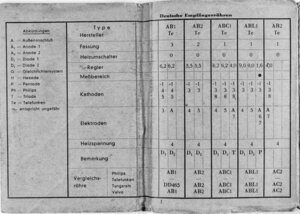 Eine Bedenungsanleitung für das Röhrenprüfgerät "TUBATEST L " der Fa. RVF (Elktrotechnische Fabrik Inh. Max Grundig in Fürth, Kurgartenstrasse 37 ) Die Anleitung , in Postkartengröße, umfasst 246 Seiten. Enthalten sind Angaben über Deutsche und Amerikanische Rundfunkröhren, Deutsche und Amerikanische Gleichrichterröhren sowie einige Seiten mit Angaben über "Sonstige" Rundfunk und Gleichrichterröhren. Ingesamt enthält die Anleitung Meßdaten von über 1.700 Röhrentypen. Das Gerät kann mit 220 V oder auch 110/125 Volt Wechselstrom betieben werden.