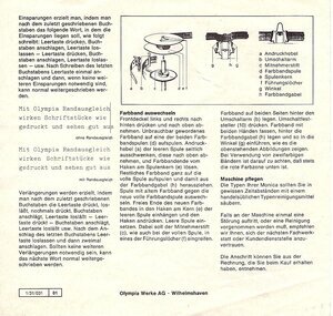 Die Bedienungsanleitung für die Schreibmaschine Olympia Monica erklärt auf 4 Seiten alles was zum Betrieb der Maschine wissenswert ist. Das Deckblatt ist in dem Olympia grün gehalten, der Rest in s/w gedruckt. Einige Abb runden die Erklärungen ab,