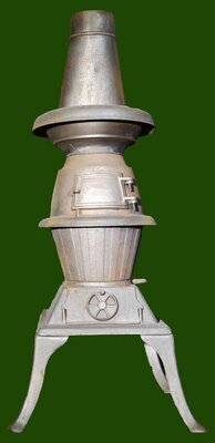 Chinesischer Werkstattofen mit Koch- bzw- Warmhalteplatte. Nicht mir Schamotte ausgekleidet. Ein Rost (aber kein Rüttelrost) befindet sich über der Brennkammer. An der Rückseite die Inschrift "TAIWAN". Innen auf der Klappe befindet sich ein "M". Der Ofen ist nicht mit Schamotte ausgekleidet.