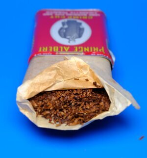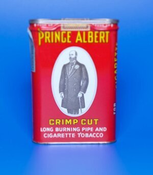 Prince Albert, ein Pfeifentabak der Firma Reynolds, der hauptsächlich in den USA verkauft wird. Schon in den 1930er Jahren war es einer der größten Geldbringer der Firma. In Deutschland wurde die rote Blechdose in ovalem Format bis in die 1980er Jahre verkauft. Dann verschwand die Marke. Namensgeber war Edward der VII der auch unter dem Namen Prince Albert bekannt war. Sein Bild ist auf der Packung zu sehen. Unser Objekt , eine gut erhaltene Packung, ist noch komplett mit Tabak gefüllt, trägt jedoch keine deutsche Steuerbanderole