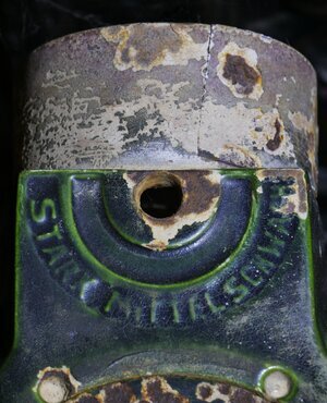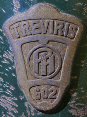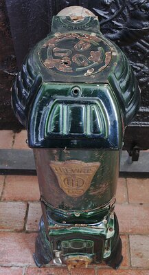 Grün emaillierter Füllregulierofen. Die Emaillierung an der Aussenseite ist stark beschädigt. Der Ofen steht auf 3 Füßen und ist im Inneren mit Schamotte ausgekleidet. Es existiert nur eine Türe für Feuerraum und Aschekasten. Zwischen diese befindet sich im Inneren ein Rost. An der Türe und am Abzug zum Schornstein befindet sich je eine Reguliermöglichkeit. An der Fronttür und an der Füllklappe spärliches Dekor im Stil der 1920er-Jahre. Oben befindet sich eine Platte zum Kochen, bzw. zum Warmhalten von Speisen. An der Frontseite die prangt die Plakette "TREVIRIS PH 602". "PH" steht für Peter Heil ein alteingesessenes Eisenwaren- und Haushaltsgeräte Geschäft in Trier. Es hat noch bis in die 1980er-Jahre existiert und ist dann Pleite gegangen. Ob der Ofen extra für Peter Heil hergestellt wurde, oder ob die auf einen dieser doch relativ häufig zu findenden Öfen einfach sein Logo draufgeklebt hat, ist leider nicht mehr rekonstruierbar.