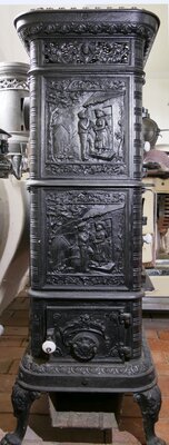 Zweistöckiger Margarethenofen, aufgrund seines Herstellers auch Vogesenofen genannt. Er ist mit überquellenden Schmuckelementen überzogen. Die Frontseite ist überwiegend mit floralen Elementen geschmückt. Die beiden jeweils zweiflügligen Türen sind mit je einem männlichen und einem weiblichen Portrait geschmückt, wobei diese auf den beiden Türen identisch sind. Unter den Türen befindet sich zwischen ornamentalem Schuck die Herstellerangabe: DE DIETRICH 8 G.NIEDERBRONN . Neben traditionellen Produkten baute dieses Unternehmen um 1900 an seinem Stammsitz in Niederbronn im Elsaß auch Automobile. Die beiden Seitenwände sind mit 4 identischen Gussplatten geschmückt. Diese zeigen einen Mann und eine Frau. Der Mann spielt auf einem Blasinstrument, im Haus sieht man Elemente einer Kücheneinrichtung. Der Ofen wird von der linken Seite aus beheizt. Die Türe zur Brennkammer besitzt eine Regulierschraube. Über dieser die Beschriftung "no 12". Unter der Brennkammer hängt zwischen den Löwenfüßen eine Halterung zur Aufnahme der Aschenschale. Die Aschenschale selber ist verlustig gegangen, ebenso der Knopf des Deckels. Auf allen drei Ebenen befinden sich Ringe im Boden. Diese können herausgenommen werden um Töpfe zum Kochen, bzw. zum Warmhalten von Speisen in das Loch stecken zu können. Hierfür wird ein Teil der Luft aussen um die unteren beiden Stockwerke herumgeführt.