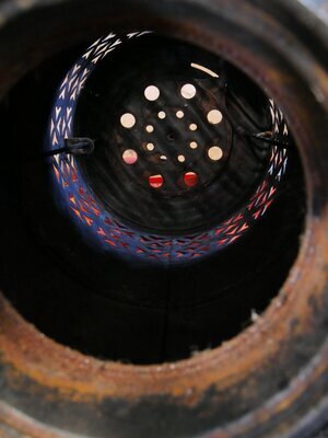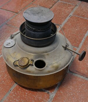 Belgische Petroleumlampe Modell: Ardent (übersetzt: Brennend) Hersteller: Belgian Sepulchre, Sepulchre ist - in verschiedenen Schreibweisen - der Name einer verzweigten Unternehmerdynastie, die vor allem im Raum zwischen Namur und Lüttich angesiedelt war. Die Lampe besteht aus 2 Teilen: Der Hülle aus Eisenblech und dem "Innenleben" aus Kupfer und Glas. Die Hülle kann - je nach Modell - auch ein ganz anderes Innenleben enthalten. Die Spanne reicht hierbei von modernen Leuchtmitteln bis zu einem kleinen Ofen. Ensprechende Angebote waren im September 2021 z.B. auf etsy.com und ebay.be zu finden. Unten an der Hülle befindet sich eine Plakette mit folgendem Text: "Ardent - heating lamp - Sepulchre Belgique". Das Glas der Lampe hat einen kleinen Sprung. Wird der Glaszylinder von innen erleuchtet, so erstrahlt rotes Licht. Gleichzeitig dient die Lampe auch als Heizung. Die heiße Abluft des Brenners sammelt sich in dem Raum oberhalb des Glaszylinders und erwärmt (etwas) den umgebenden Raum.