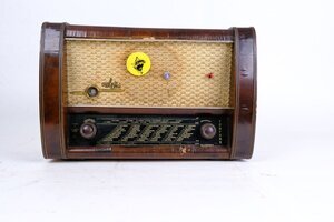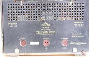 Die Frma Tonfunk aus Karlsruhe, stellte ab 1945/46 Radios unter dem Namen Tonfunk her. Abnehmer waren der Fachhandel und -unter anderem- auch das Versandhaus Quelle. 1964 übernahm Grundig/Fürth die Firma und löste sie Anfang der 1970er Jahre auf. Unser Modell „Tonfunk Violetta W 200“ ist ein Tischgerät mittlerer Größe aus den Jahren 1951/52. Das furnierte Holzgehäuse zeigt deutliche Gebrauchspuren. Der Lautsprecher befindet sich hinter einer Stoffabdeckung, an der, der letzte Besitzer, einige Anstecker angebracht hat. Mit dem seitlichen Drehschalter werden WM, KW, LW und UkW, sowie der Tonabnehmer eingeschaltet. Das Magische Auge unterstützt optisch die Einstellung der Sender. Für ca. 250 DM wurde das Radio im Fachhandel verkauft.