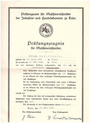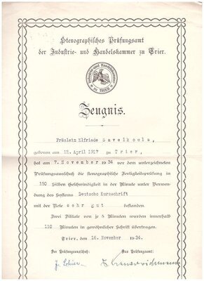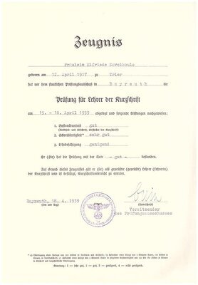 Elfriede (Friedel) Savelkouls legte im April 1939 vor dem staatlichen Prüfungsauschuss in Bayreuth ihre Prüfung zur Lehrerin in Kurzschrift ab. In diesem Zeugnis werden ihr gute Leistungen beschieden. Beigefügt ist ebenfalls eine Schriftprobe aus der angesprochenen Prüfung. Mit dem Abschluss der Lehrerausbildung konnte Elfriede Savelkouls in die der Schule ihres Vaters als Lehrkraft eingesetzt werden.