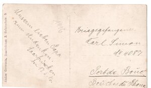 Zu sehen ist eine schwarz gekleidete Frau, die auf einem Schemel sitzt. Das Kleid ist hochgeschlossen. Sie blickt ernst in die Kamera. Neben ihr steht auf einem Podest ein Kleinkind. Das Kind schaut mit großen, ernsten Augen ein wenig ängstlich in die Kamera. Bei dem Kind handelt es sich um Tilli Simon ( 1940). Es trägt ein knielanges Kleid mit dreiviertellangen Ärmeln. Der Brief ist an den Ehemann und Vater adressiert, welcher sich in französischer Kriegsgefangenschaft befindet.