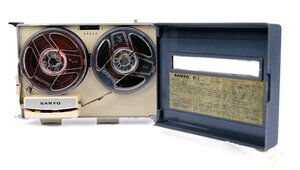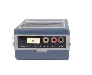 Unser Objekt ist ein sehr kleines, handliches (Reise) Tonbandgerät, der Firma Sanyo. Hergestellt wurde das Kleinst-Tonbandgerät 1965 und verfügt über die notwendigsten Funktionen wie Vor-/Rücklauf, Aufnahme (auch über Microfon) und einem Kopfhöreranschluss. Die Stromversorgung erfolgte über 4 x 1,5 Volt Batterien. Das Gehäuse ist aus dunkelgrauem Thermoplast gefertigt. Unser Objekt ist -zum Schutz- in einer ledernen, schwarzen Schutzhülle umgeben. Das Gerät wurde in den 60er Jahren auch vom Versandhaus Quelle vertrieben.