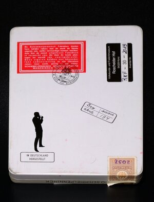 Schimmelpenninck, war eine Holländische Zigarrenfabrik, die heute nicht mehr existiert. (Wurde an die BAT verkauft) Sie war bekannt für schlanke Zigarren, dem sogenannten Panatelle Format. So auch unser Objekt mit dem Namen Con Mil Amores. Mit fast 16 cm Länge ist die Zigarre verpackt in einer bunt bedruckten Blechpackung, mit 10 Stück Inhalt und einem Preis von 8 DM/Packung. Auf der Unterseite findet sich unter Anderem der Hinweis: Hergestellt in Deutschland. Unsere Packung ist noch komplett gefüllt und trägt eine deutsche Steuerbanderole mit dem Herstellercode 2057.