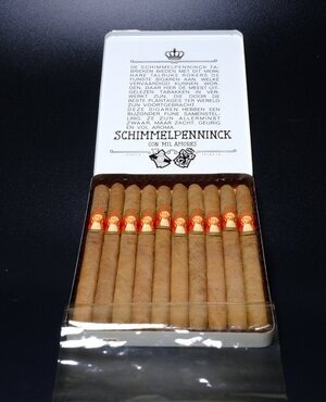 Schimmelpenninck, war eine Holländische Zigarrenfabrik, die heute nicht mehr existiert. (Wurde an die BAT verkauft) Sie war bekannt für schlanke Zigarren, dem sogenannten Panatelle Format. So auch unser Objekt mit dem Namen Con Mil Amores. Mit fast 16 cm Länge ist die Zigarre verpackt in einer bunt bedruckten Blechpackung, mit 10 Stück Inhalt und einem Preis von 8 DM/Packung. Auf der Unterseite findet sich unter Anderem der Hinweis: Hergestellt in Deutschland. Unsere Packung ist noch komplett gefüllt und trägt eine deutsche Steuerbanderole mit dem Herstellercode 2057.