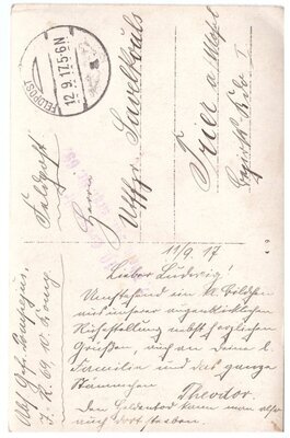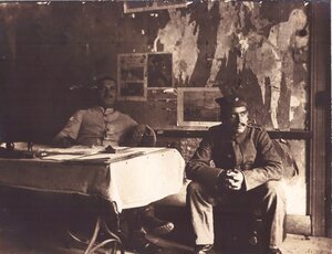 Zu sehen sind zwei Soldaten im ersten Weltkrieg. Sie sitzen in einer provisorischen Unterkunft mit Gartentisch und Holzkisten, die Tapete an den Wänden ist abgerissen. Der eine ist der Theodor Pompejus. Dieser sitzt auf einer Kiste und schaut nachdenklich und mit gefalteten Händen und in sich verschränkten Fingern am Fotografen vorbei. Links, etwas hinter ihm, sitzt ein Soldat in einer hellen Uniform an einem Tisch. Auf diesem Tisch liegen einige Schriftstücke und Schreibgerät. An der Wand hinter ihnen kleben große Fotos und ein Flugblatt.