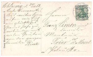 Zu sehen ist ein Laden, der Waren des täglichen Gebrauchs anbietet. In zwei Schaufenstern wurden die verschiedensten Sachen zur Schau gestellt. Hinweise, auf weitere, im Laden befindliche, Waren geben Blechtadeln an den Seiten der Schaufenster. Der Eigentümer des Ladens steht vor der Eingangstür. Der Laden befindet sich, wie der Rückseite der Karte zu entnehmen ist, in Schleswig.