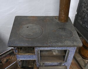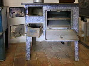 Es handelt sich um einen emaillierten und blau-weis gesprenkelten kleinen Sparherd, der sowohl zum Heizen als auch zum Kochen benutzt wurde. Er konnte nach dem 2. Weltkrieg von Heimatvertriebenen und Ausgebombten mittels Bezugsschein erworben werden. Im linken Drittel des Ofens befinden sich 2 Türen. Die obere dient zum Einbringen des Brennguts. Hinter der unteren Tür ist der Aschekasten. Dazwischen befindet sich im Inneren eine Rost (kein Rüttelrost). An der unteren Tür befindet sich eine Regulierschraube. Die restlichen 2/3 der Front werden zum größten Teil von dem mit einer Klappe verschließbaren Ofenrohr eingenommen. Die Außenwände links, rechts und hinten sind innen mit Schamotte verkleidet. Die zweigeteilte Herdplatte hat zwei runde Löcher um Töpfe einzuhängen zu können. Sie können aber auch mit jeweils einer runden Eisenplatte abgedeckt werden. Man kann darüber spekulieren, ob der Herd aus Mariahütte seine Emaille erst in einer Nachkriegsproduktion vielleicht aus Überschussbeständen erhalten hat, um ihn etwas schöner aussehen zu lassen. Inschrift G. 62 - 7 G. GOTTBILL SEL.ERBEN GMBH. MARIAHÜTTE KRS. TRIER Mariahütte liegt beim Autobahndreieck Nonnweiler und kam erst nach dem 2. Weltkrieg zum Saarland, vorher gehörte es zum Kreis Trier. Die Hütte ist nach wechselnder Geschichte im Diehl-Konzern aufgegangen. Heutiger Name Diehl-Defence Werk Mariahütte