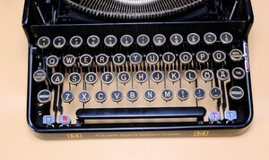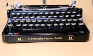 Die Firma Seidel und Neumann aus Dresden, produziert seit 1900 Schreibmaschinen. Zu Beginn war es die große Büromaschine der Marke IDEAL, ab 1910 folgte die kleine Reise- oder Kleinschreibmaschine Erika. Nach 1945 wurde die Firma enteignet und in die spätere VEB Robotron eingegliedert. Unser Modell ist eine Erika 5 aus dem Jahr 1940 mit der Herstellungsnummer 894 157 ZM. Produziert als Top Modell, was äußerlich an dem Zusatzbuchstaben M (= Meisterlich) auf dem Gehäuses ersichtlich ist. Außer einem Tabulator verfügt die Schreibmaschine noch über S P E R R-Schrift. Technisch handelt es sich um eine Typenhebelschreibmaschine mit Wagnergetriebe, 4 reihiger Tastatur, Zeilenschalthebel, Bandumschaltung und einer Q-W-E-R-T Tastatur. Die Maschine wird von einem festen Koffer aus Sperrholz geschützt, der mit schwarzem, textilverstärktem Papier bezogen ist. Die Schreibmaschine ist noch in einem ordentlichen Zustand, schreibt problemlos und hat einen weichen, angenehmen Anschlag. Leider fehlt die Abdeckung von der Oberseite. Der dazugehörige Koffer, mit schwarzem Textilpapier bezogen, hat deutliche Gebrauchspuren.