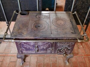 Stattlicher Regulierherd, violett emailliert im Jugendstildekor im Freilichtmuseum Roscheider Hof. Der Ofen steht auf geschwungenen Füßen im gleichen Dekor. Oben führt ein Geländer um den ganzen Ofen mit Ausnahme der Rückseite. Rechts befindet sich oben eine Tür mit einem defekten Schiebergler zum Befüllen des Ofens. Darunter und ganz unten ist die Aschschublade mit einem Drehregler. Über dem Drehregler befindet sich die Inschrift: C. GOTTBILL No SEL. ERBEN 110 MARIAHÜTTE Erhalten ist nur die Hülle - das "Innenleben" des Herds ist nicht mehr vorhanden. Mariahütte liegt beim Autobahndreieck Nonnweiler und kam erst nach dem 2. Weltkrieg zum Saarland, vorher gehörte es zum Kreis Trier. Die Hütte ist nach wechselnder Geschichte im Diehl-Konzern aufgegangen. Heutiger Name Diehl-Defence Werk Mariahütte. Der Küchenherd ist weitgehend identisch mit HR / 696 / 2021. DIeser ist jedoch nicht emailiert und Brennkammer und Ofenrohr sind vertauscht.