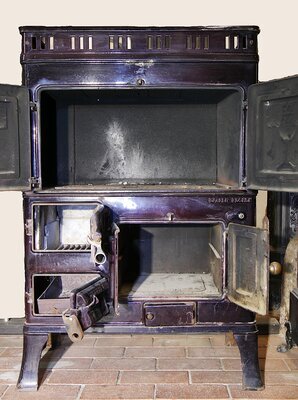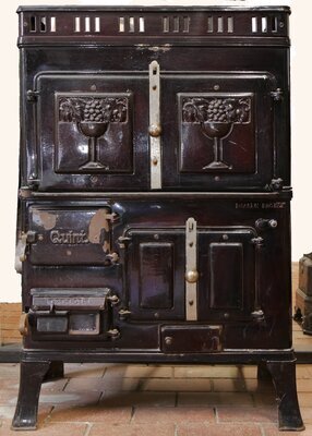 Großer, dunkelrot bis braun emaillierter zweietagiger Rheinischer Tafelherd (Kochofen), der auf vier schlichten Füßen steht. In der unteren Etage findet sich links die Heizung mit zwei Türen: oben - mit der Aufschrift "Quint" - eine Tür vor der Öffnung zum Nachlegen des Brennguts und unten - mit Schiebereguliereinrichtung und der Skala von 1 bis 5 darüber - eine Tür als Zugang zum Brennraum. Rechts oben über diesem ist ein Kippschalter zum Umschalten von Backen zum Kochen. Konkret wird dabei die heisse Luft wunschgemäß geleitet. Im ersten Stock befinden sich zwei mit Abbildungen von je einem Weinglas und einer Traube geschmückte Türen, dahinter die Kochplatte mit eingelassenen Ofenringen. Über dieser ist nochmals eine Herdplatte die die Möglichkeit bot Essen warm zu stellen. Hergestellt wurde der Ofen von der Eisenhütte in Quint (heute ein Stadtteil von Trier). Diese wurde 1683 gegründet und entwickelte sich im Laufe der Zeit zu einem bedeutenden Unternehmen. Sie betrieb von 1857 bis 1891 bei Schweich ein eigenes Eisenbergwerk. Nach mehrfachem Besitzerwechsel kommt das Unternehmen zum Klöckner-Konzern, der 1925 das Walzwerk stilllegt und zum 31.1.1972 diesen Unternehmensteil ganz aufgibt. Quint-Öfen wurden von Ende des 17. Jahrhunderts bis 1960 hergestellt. Heute (2021) sind nur noch das Schloss des Hüttenherrn und einige Verwaltungsgebäude erhalten.