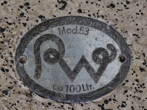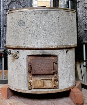 Ein 100l fassender von unten beheizbarer Kessel der Marke Ranke. Ein Waschkessel ist ein beheizbarer Behälter, der zum Erhitzen von Wasser bzw. Waschlauge dient und in dem Wäsche gewaschen wird. Die Beheizung erfolgt meist durch ein Holz- oder Kohlenfeuer. Bis zur allgemeinen Verbreitung der Waschmaschine ab den 1960er Jahren gehörten Waschkessel zur Ausstattung der meisten Haushalte, heute werden sie nur noch selten verwendet. Der Kessel konnte für verschiedenste andere Zwecke verwendet werden: Als Waschkessel zum Wäsche waschen, als Wurst- oder Schlachtkessel oder auch in Gerbereien. In der Landwirtschaft wurde er auch zur Zubereitung von Viehfutter, zum Erhitzen von Gläsern beim Einwecken und Eindosen verwendet. Der abgebildete Kessel ist aussen aus Beton gefertigt und besteht aus zwei Teilen: der obere Teil verbirgt in einer Betonschale einen Kupferkessel der mit einem eisernen Deckel abdeckt ist. Aussen an der Betonverkleidung befindet sich die Modellbezeichung "Mod53 RW ca 100 Ltr." mit einem künstlerisch geschwungenen RW. RW steht dabei für RankeWerke GmbH, Brühl Bezirk Köln. Darunter befindet sich der Ofen mit zwei Türen - oben zum Befüllen und als Zugang zur Brennkammer, darunter eine Tür als Zugang zur Aschekammer. Auf der oberen Tür befindet sich der Schriftzug "Original Ranke". Linksoben von der Brennkammer befindet sich ein Ablasshahn für die Flüssigkeit im Kupferkessel darüber.