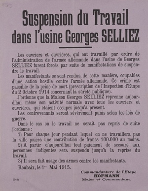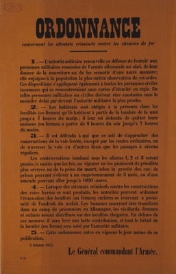 Wandanschlag in französischer Sprache. Herausgegeben im von Deutschland besetzten Frankreich; Lille, den 4. Februar 1915. "Avis important Il est strictement défendu aux populations du territoire occupé par l’armée allemande, d’entretenir des relations ou communications avec celles du territoire ennemi non encore occupé ainsi qu’avec celles des territoires neutres. Des infractions à cette prescription, à moins qu’elles ne relèvent des lois, plus sévères, contre la trahison en cas de guerre, seront punies de prison pouvant aller jusqu’à cinq ans, des cas moins graves d’emprisonnement jusqu’à six semaines, ou de saisie de biens totale ou partielle. Le Général Commandant l’Armée."