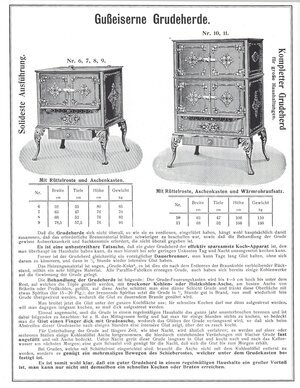 Küchenherd zum Heizen mit Grudekoks. Grude bezeichnete in Sachsen, Thüringen und Brandenburg eine Vertiefung auf dem Kochherd, welche man mit Grudekoks füllte, um in dieser angekochte Speisen langsam gar werden zu lassen und warm zu halten. Grude oder Grudekoks bezeichnet Koks-Rückstände, die bei der Braunkohlen-Schwelerei für die Paraffin- und Mineralölfabrikation entstehen. Die Grude bleibt nach dem Abtrieb des Teers in den Retorten oder Schwelöfen zurück. Der Grudekoks ist schwarz, pulverig, leicht entzündlich, brennt langsam, ruhig und glimmend und eignet sich daher zur Erzielung einer milden, gleichmäßigen Hitze. Da es für ihn keine andere Verwendung gab, war er ein preiswertes Brennmaterial. Grudeherde waren nicht sehr weit und vor allem in Bergbaugebieten verbreitet, wo Grude vor Ort kostengünstig zur Verfügung stand. Grudeherde sind Dauerbrenner, die tagelang die Glut halten können ohne dass sich jemand darum kümmern muß. Die Glut kann bei Bedarf in einer halben Stunde wieder intensivieren werden. Unter dem Rost für die Töpfe befindet sich der Grude-Feuerungskasten. Ein Grudeofen wird in Betrieb gesetzt indem im Feuerungskasten auf eine Schicht Kohlen- oder Holzkohlenasche Grude geschüttet und mit Spiritus entzündet wird. Der Ofen brennt dann das ganze Jahr über. Wird er gerade nicht zum Kochen benötigt, so wird die Grude mit einer Schicht Grudeasche abgedeckt und glimmt dann weiter. Der Ofen bedarf nur einer geringer Beaufsichtigung, da einmal entzündete Asche lange fortglimmt. (Quelle: Katalog über Kochherde aller Art, Hütte unbekannt, 1909, Seite über Grudeherde, Abgedruckt in Hammer, Michelberger, Schremm, S.196, siehe Abbildung unten.) Die Frontseite und die Seitenflächen unseres Grudeherds sind weiß emailliert. Ebenso die noch vorhandenen Griffe. An der linken Seitenfläche befindet sich ein Thermometer und mehrere Löcher zur Anbringung von nicht mehr vorhandenen Teilen. Die Frontseite ist in vier Stockwerke mit Fächern untergliedert. Das oberste Fach besitzt eine zweiflüglige Tür und ist mit Blech ausgekleidet. Das darunterliegende Fach besitzt ist mit einer Klapptür deren Griff leider verlorengegangen ist, verschlossen. Dazwischen befindet sich die Aufschrift "Orignial Immerbrand ". Im darunterliegenden Stockwerk befinden sich Luftschlitze und eine Schublade aus Blech. Ganz unten am Boden ist eine weitere Schublade deren Griff leider nicht erhalten ist. Der Herd ist ein Geschenk aus Klein-Blittersdorf (Saarland, südlich von Saarbrücken). Der Hersteller, die Firma Immerbrand war vor 1945 in Liegnitz ansässig. Liegnitz liegt etwa auf halber Strecke zwischen Breslauf (Wroclaw) und der heutigen deutschen Grenze.